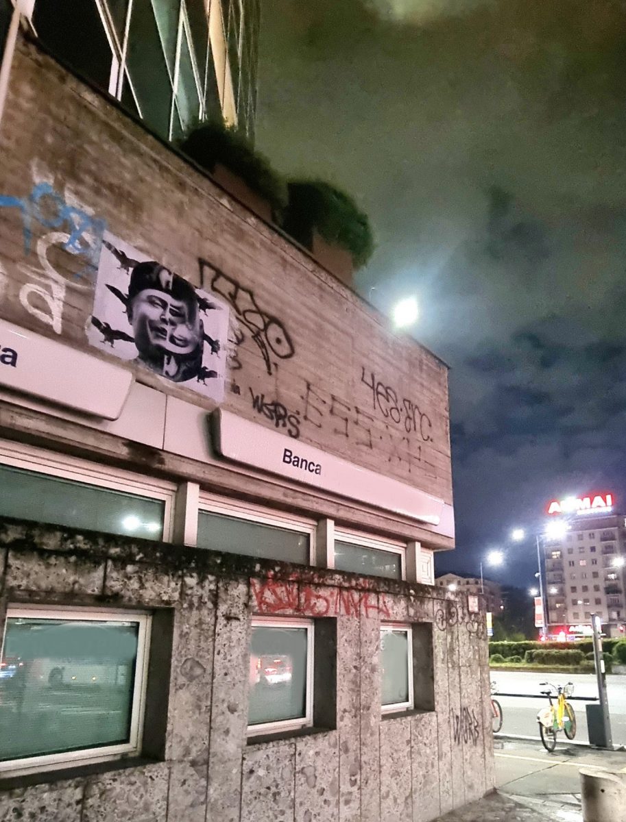Il volto del Duce campeggia in una doppia effige nel luogo in cui il suo cadavere fu esposto. L’opera si intitola “Uccellacci & Uccellini”, in riferimento a Pasolini e alla sua opera cinematografica. “Questa raffigurazione è il tentativo di parlare di un mondo che forse non esiste più, e tutto ciò mi porta a chiedermi se è ancora valido il vecchio concetto di borghesia e proletariato. Esiste ancora questo scontro di classe che Pasolini narrava così poeticamente nel suo film? Una domanda non scontata con la quale vi lascerò riflettere ognuno autonomamente nella propria intimità