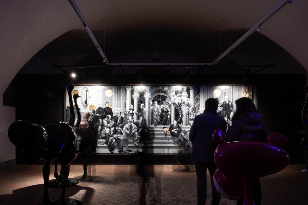 Nel “nuovo pantheon” immaginato dall’artista, Platone e Aristotele incontrano figure del ventesimo secolo come Duchamp e Dalì. Persino Michelangelo, ironicamente escluso dall’opera originale di Raffaello, trova finalmente un posto d’onore. La Scuola di Atene diventa una scena affollata di nuovi ingressi: da Bacon a Warhol, da Picasso a Cattelan, fino al geniale Steve Jobs.