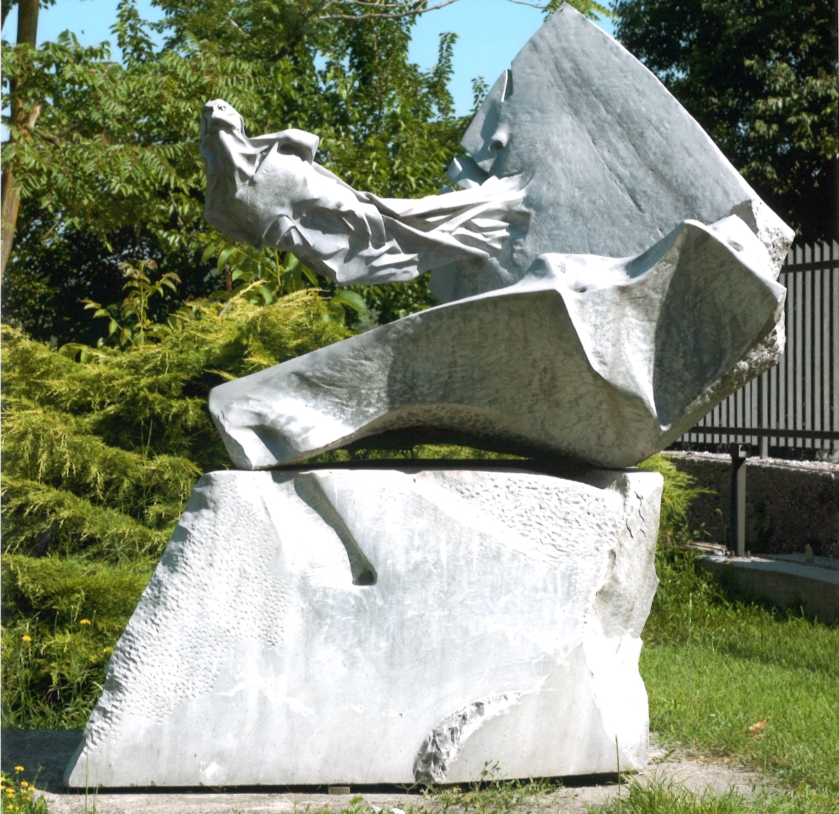 Al centro, una figura umana si staglia in uno slancio verso l’alto, tentando di sollevare il blocco in un volo apparentemente impossibile. L’opera unisce forza e fragilità, riflettendo sull’umanità e sulla sua resilienza.