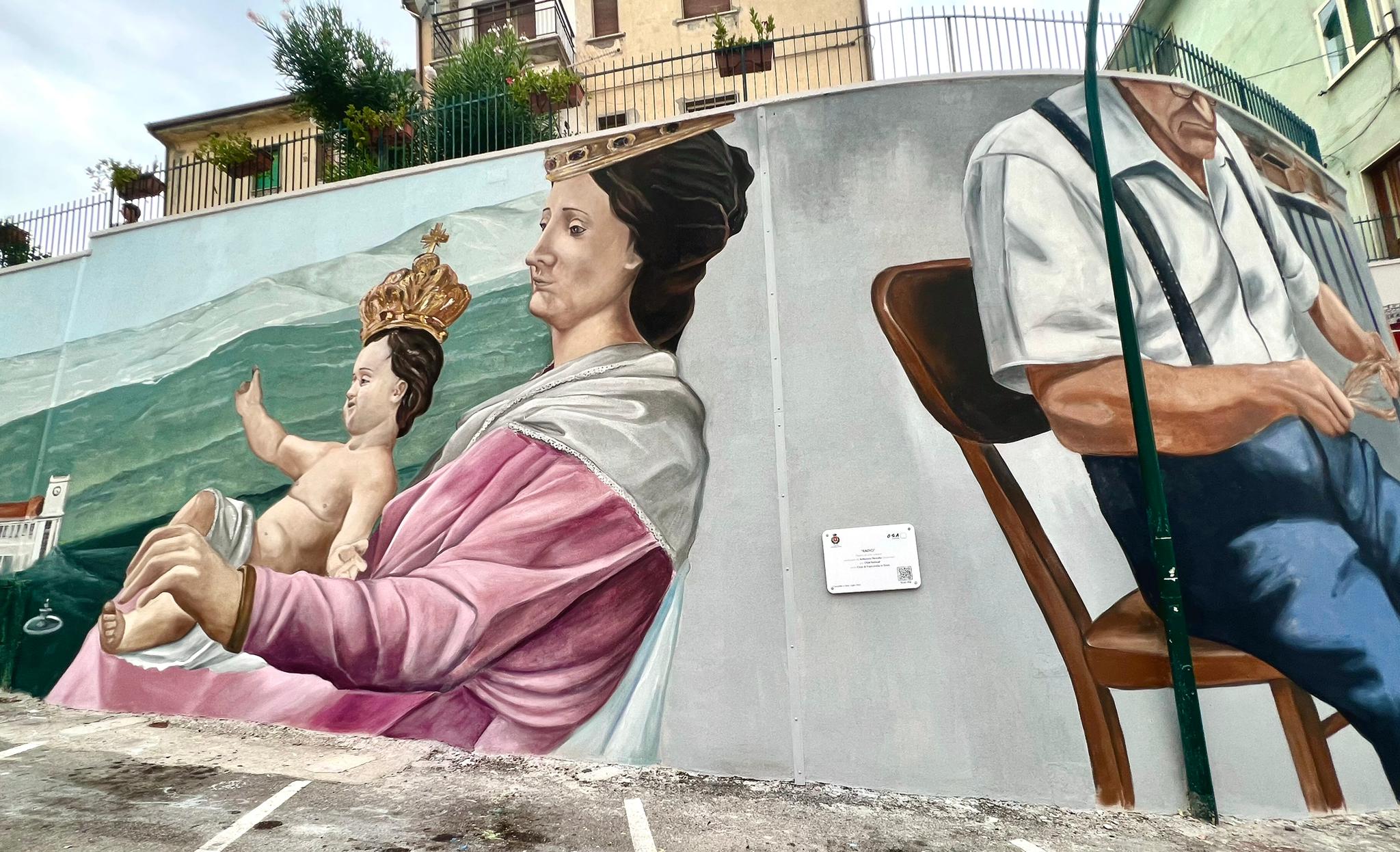 Proseguendo, il dipinto ritrae i resti della porta d’accesso al possedimento monastico, un tempo a protezione del monastero e della comunità. L’attenzione si sposta, poi, sulla Madonna di Pompei, dipinta in un contesto evocativo e rivolta verso la montagna, a simboleggiare la tradizionale processione che unisce spiritualmente il santuario alla città. Infine, l’opera culmina in un tributo all’artigianato locale, rappresentato da un artigiano intento a impagliare una sedia. Immagine che è un omaggio alla manualità e alla tradizione, richiamando la vita sociale e comunitaria che ha caratterizzato il tessuto sociale di Francavilla in Sinni.