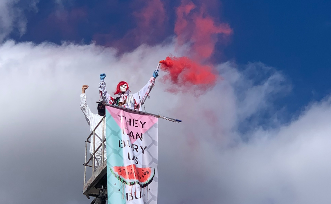 L’immagine centrale dell’opera raffigura un’anguria insanguinata, i cui semi, cadendo a terra, si trasformano in una bambina che sventola la bandiera della Palestina. Sopra l’opera domina una grande scritta che riporta il testo della canzone Hind’s Hall 2 di Macklemore: Possono seppellirci ma scopriranno che siamo semi. Un chiaro messaggio di resilienza e speranza di fronte alla violenza e alla distruzione.