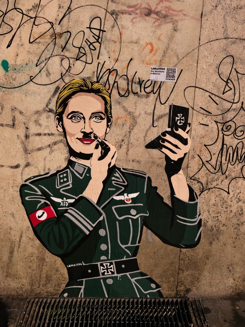 Nella mattina di lunedì 24 febbraio, all’indomani delle elezioni tedesche, è apparsa una nuova opera della street artist Laika, dal titolo Die Rückkehr – Il Ritorno. Il poster – davanti al Goethe-Institut di Roma, in via Savoia – ritrae Alice Weidel, leader del partito di estrema destra AfD (Alternative für Deutschland), vestita con un’uniforme nazista mentre, con un rossetto nero, si disegna i baffi di Hitler sul viso.
