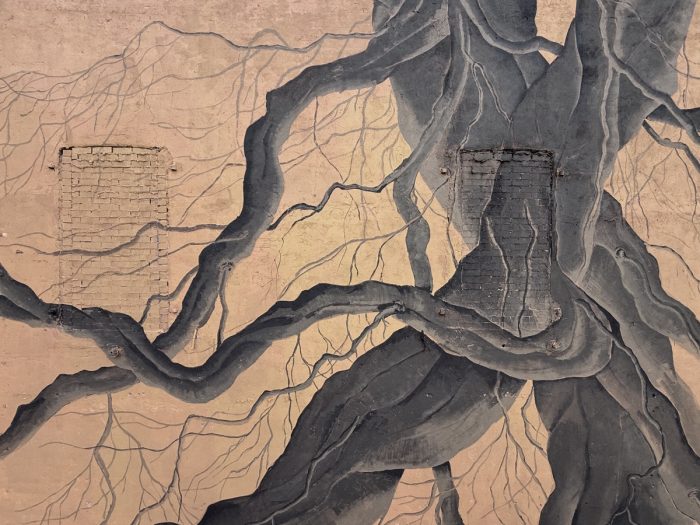 Il murale di aleXsandro Palombo riprende e amplifica quel grido. Francesco non è rappresentato come un leader spirituale lontano, ma come un uomo immerso nel dolore del nostro tempo, che si china verso chi soffre, che accoglie, che protegge. La sua figura è al tempo stesso ascetica e concreta, evocativa della grande tradizione iconografica cristiana ma reinterpretata con un linguaggio visivo crudo e urbano.