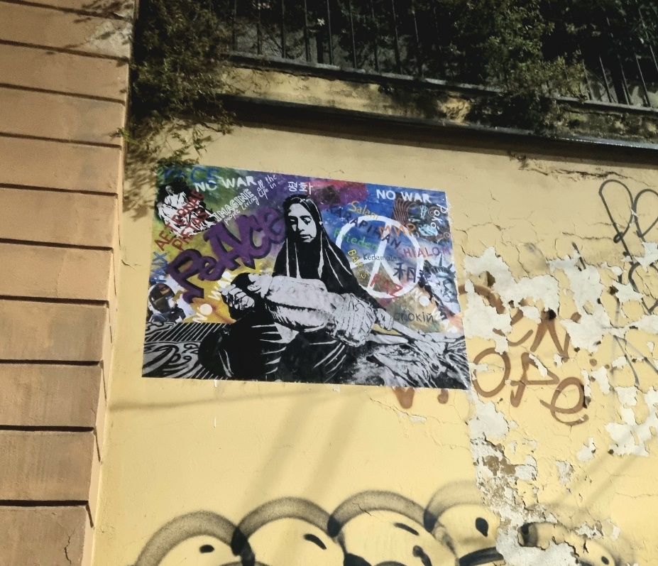 Eppure, anche qui, Rigaff non cede alla disperazione. Accanto al dolore emerge un grido collettivo, quello di milioni di persone che continuano a scrivere sui muri, a gridare NO WAR, a usare linguaggi diversi per dire una sola parola: pace.