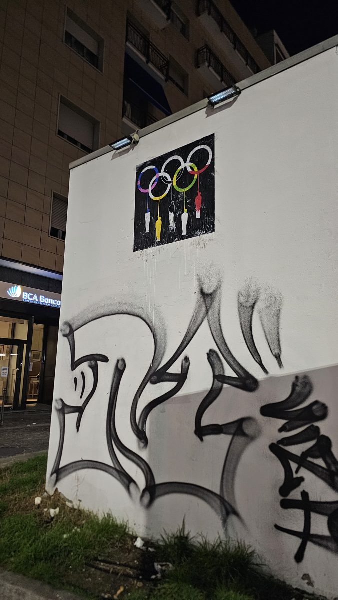 Olimpiccato – la cui riproduzione è apparsa in Piazzale Loreto, sulla piccola costruzione bianca all’imbocco di via Andrea Costa – è caratterizzata da una linearità visiva che esprime tutta la crudezza della rappresentazione.  Cinque corpi anonimi pendono da altrettante corde, legate ai cinque cerchi olimpici. Un’immagine certamente destabilizza che costringe a interrogarsi sui suoi risvolti politici e morali. La domanda sorge, infatti, spontanea: perché associare l’impiccagione a un simbolo universale di sport, pace e fratellanza?