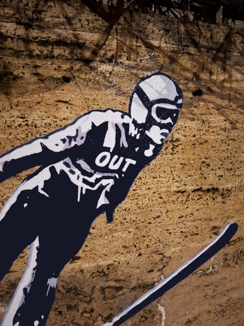 L’opera, concepita come un poster affisso nello spazio pubblico, utilizza un linguaggio diretto e simbolico: un agente dell’ICE spara contro uno ski jumper, mentre una montagna rovesciata richiama il logo dei Giochi Olimpici, con il cerchio rosso trasformato in un mirino. Un’immagine che mette in cortocircuito l’iconografia sportiva con quella della violenza istituzionale, chiamando in causa il senso stesso dello spirito olimpico.