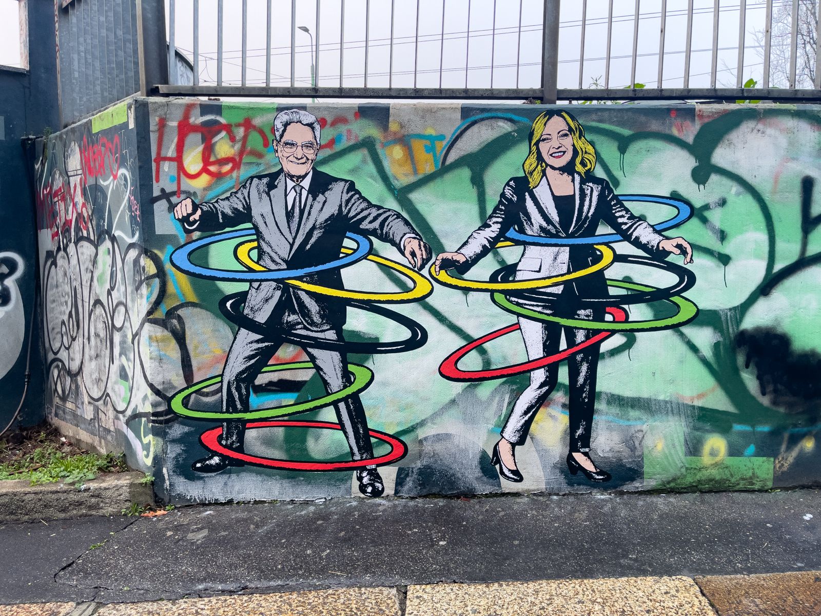 Le opere, visibili in diversi punti del quartiere, raffigurano tre personaggi chiave della scena internazionale che trasformando lo spazio urbano in un palcoscenico di riflessione. Il murale intitolato Opening Ceremony, apparso nei pressi del Cimitero Monumentale, sotto il cavalcavia di via Farini all’angolo con via Ugo Bassi, ritrae Giorgia Meloni e Sergio Mattarella mentre interagiscono in modo giocoso con i cinque cerchi olimpici.