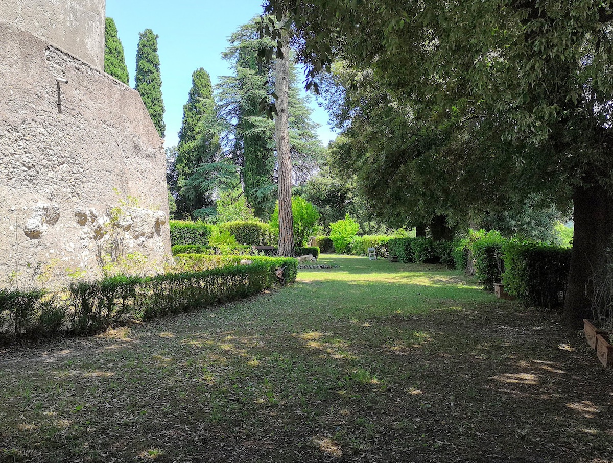 Salendo per la rampa medievale del Castello si giunge a un ampio spazio creato nel XVII secolo dai Nuñez Sanchez, un giardino che si ispira alla tradizione persiana e islamica, con siepi curate all’italiana e cisterne medievali che ne regolano l’irrigazione. Nel XIX secolo, Julie Bonaparte e Alessandro del Gallo aggiunsero elementi francesi, tra cui un giardino d’inverno e un’ampia varietà di rose ottocentesche. Affacciandosi dal muraglione si può ammirare la Valle del fiume Licenza, al centro della valle il comune di Vicovaro, famoso per il suo Tempietto di San Giacomo e, ancora più a sinistra, il Convento di San Cosimato, testimone di eventi storici, tra cui la riconciliazione tra Papa Martino V e Re Alfonso d’Aragona, che pose fine allo Scisma d’Occidente.