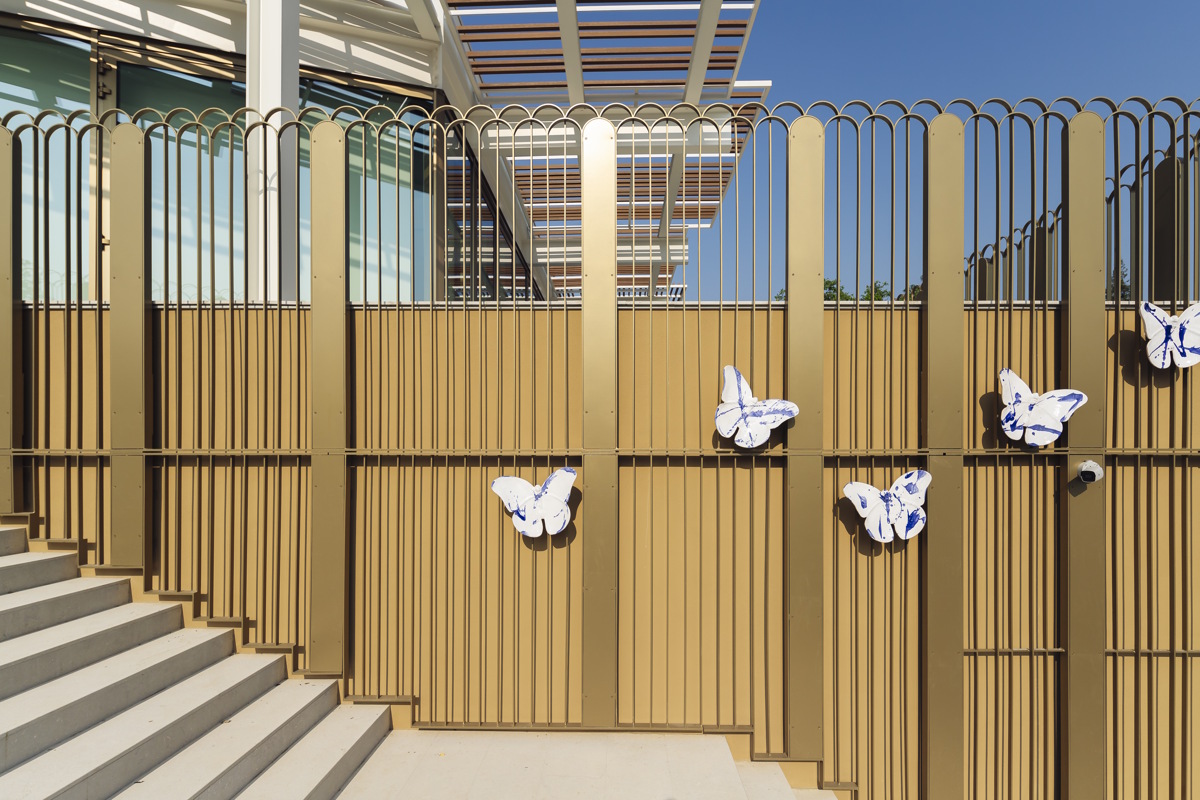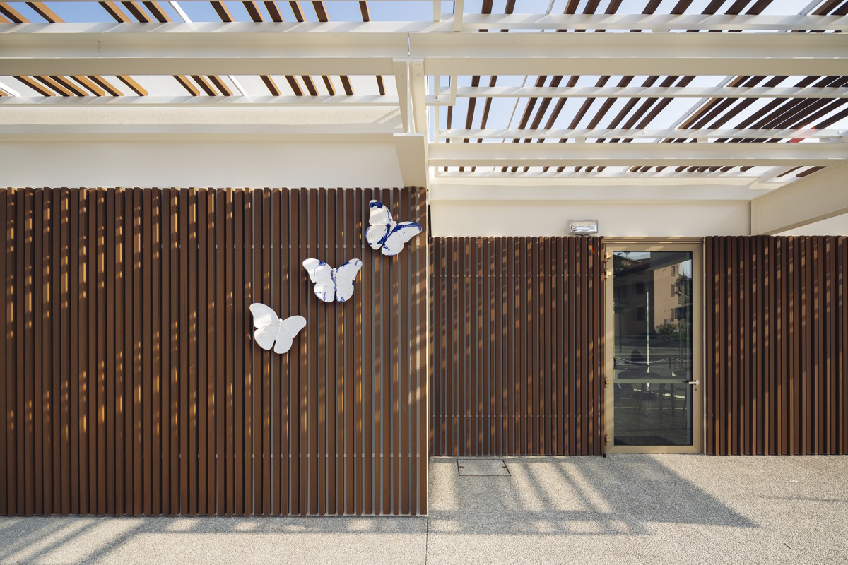 L’edificio, un tempo anonimo fienile rurale, si trasforma in un simbolo di impegno sociale grazie a Femia. Le sue pareti ospitano uno sciame di farfalle bianche e blu, realizzate dal ceramista Danilo Trogu, parte del Bestiario Mediterraneo. Queste decorazioni, che ispirano il logo di Gianluigi Pescolderung (Tapiro Design), catturano lo sguardo dai finestrini della SP28, invitando a rallentare e apprezzare luce e colori. La facciata d’ingresso si apre sulla strada, mentre il retro si affaccia sul torrente Ceno, contornato dal Parco dei Melograni, creando un dialogo naturale con il territorio della Val Ceno.