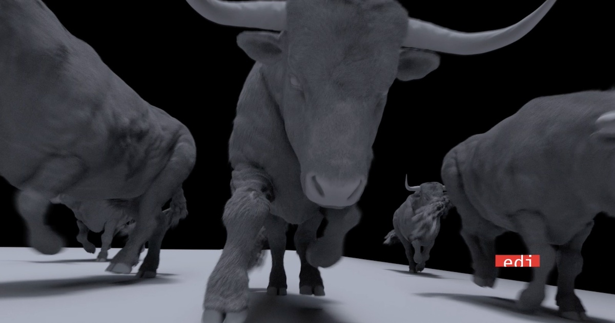 La ragione è semplice e spettacolare: al centro della scena compare una Ferrari. L’auto è stata ricostruita in CGI e integrata nel contesto urbano, attorno — e sopra — la quale si muovono tori digitali fotorealistici, tutti diversi tra loro. Grazie a un sistema di destruction, gli animali salgono sull’auto, la deformano, la distruggono progressivamente, generando una sequenza dinamica e sorprendentemente credibile. A completare il quadro, una folla digitale complessa: persone che corrono, inciampano, assistono, ricreando il caos controllato tipico della corsa.