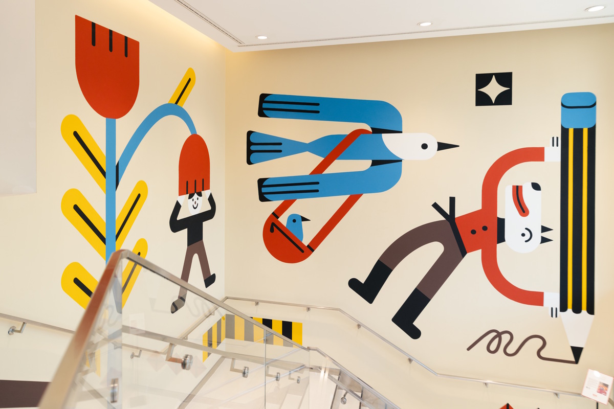 La città – osservata attraverso la lente giocosa e surreale dell’artista – diventa un microcosmo popolato da individui che corrono, volano, osservano e immaginano. Una Milano familiare e al tempo stesso fantastica, che accompagna l’esperienza d’acquisto trasformando l’ingresso nello store in un piccolo viaggio narrativo.
