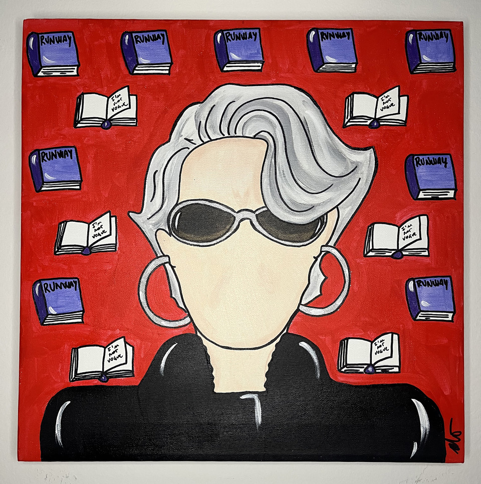 Il nuovo allestimento mette in scena il doppio linguaggio creativo dell’artista. Da una parte, infatti, ci sono le tele pop e colorate dedicate ai grandi nomi della moda e, dall’altra, gli abiti di alta sartoria firmati Maison Olivia. Al centro, il ritratto di Miranda Priestly, trasformato in osservatore silenzioso che sembra giudicare opere, abiti e persino i visitatori.
