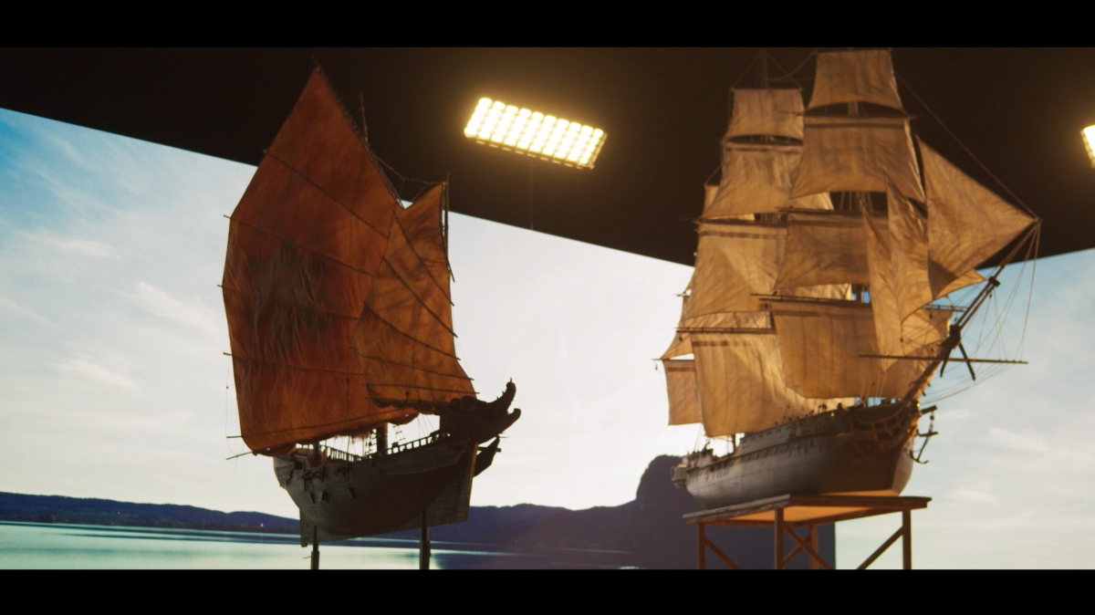 L’intero set è stato rialzato di un metro per consentire alle camere di riprendere l’orizzonte virtuale senza interferenze con il soffitto dello studio. All’interno del volume LED venivano proiettati ambienti CG a 360°, footage reali e live feed, creando un’unica dimensione mista dove gli attori interagivano con un mare che “esisteva” realmente intorno a loro.