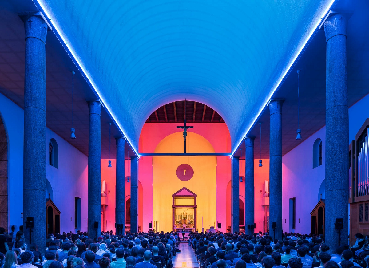 La chiesa progettata da Giovanni Muzio nel 1932 ospita dal 1997 l’installazione luminosa Untitled di Dan Flavin, realizzata da Fondazione Prada con Dia Center for the Arts di New York e Dan Flavin Estate. La successione cromatica dei neon, che attraversa navata, transetto e abside, trasforma lo spazio in un ambiente immersivo dove luce e suono si intrecciano durante il concerto di Mortazavi.