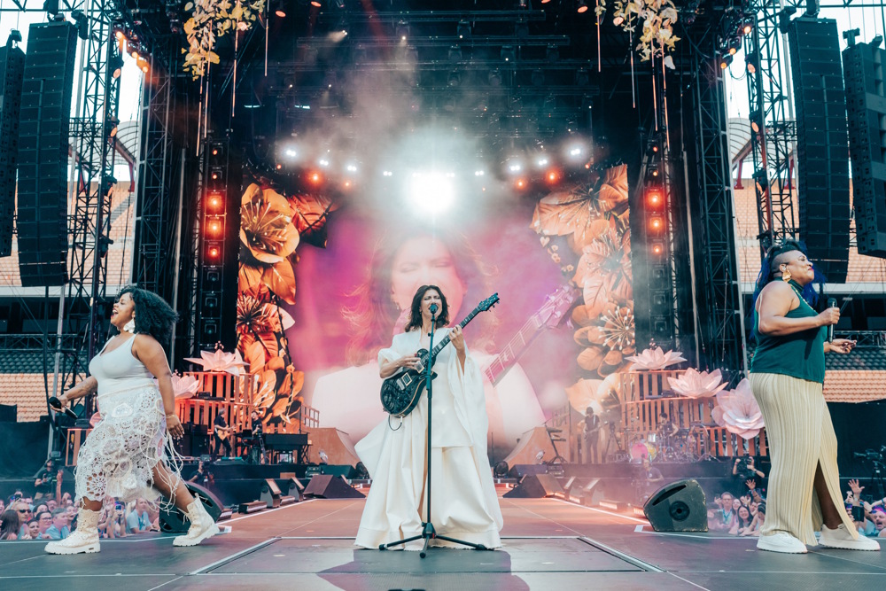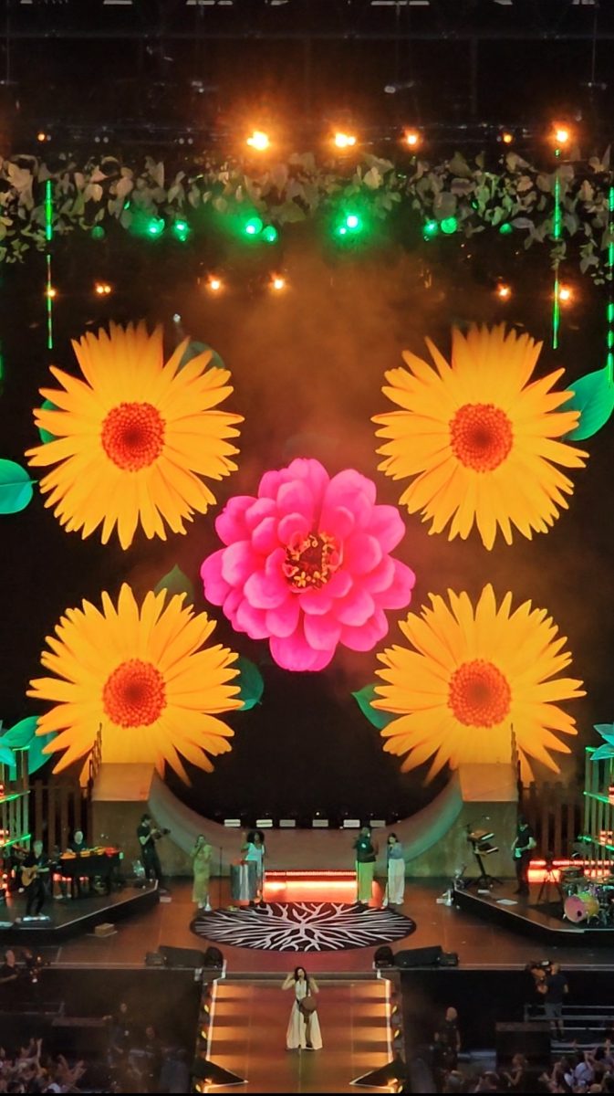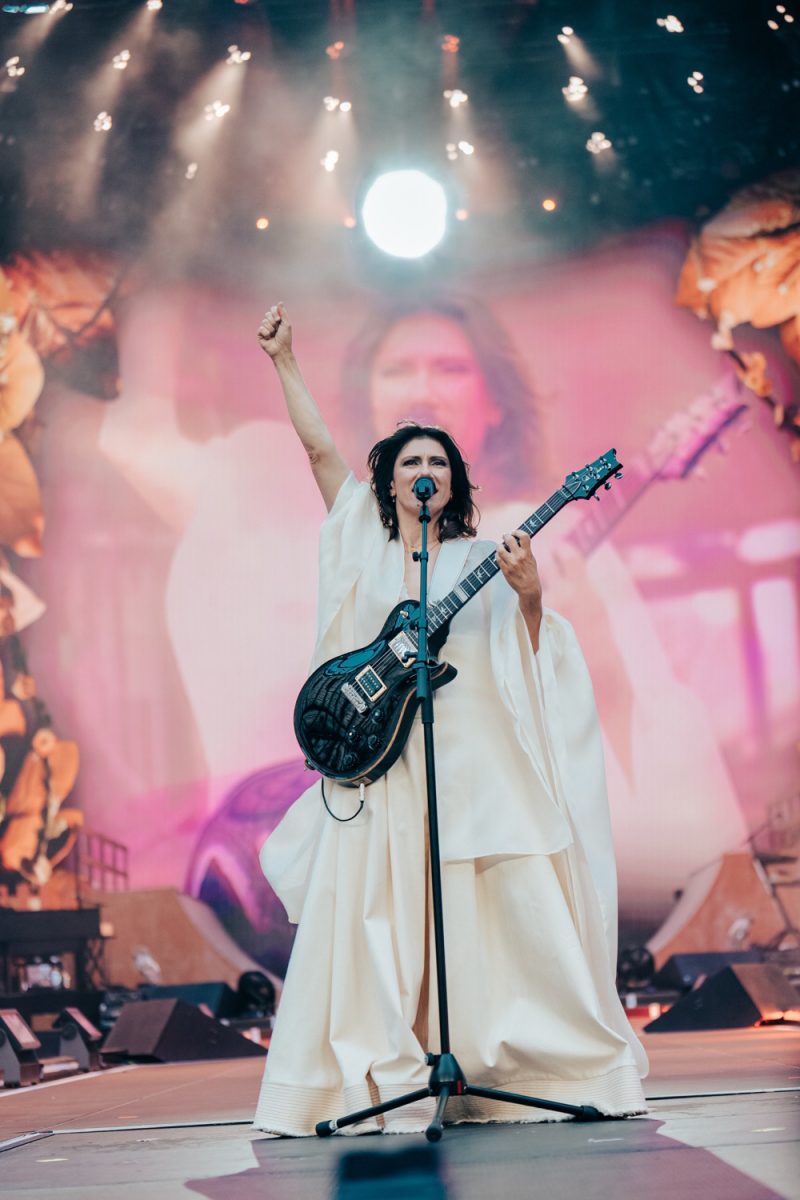 Chitarra in braccio e voce dritta come un proiettile fin dalla prima nota, la Toffoli incanta per quasi tre ore immersa in una scenografia vegetale, tra ali di enormi e leggeri fiori bianchi e ramificazioni verdeggianti a fare da cornice. E poi fioriture colorate, onde, vibrazioni colorate che si espandono. La terra, il mare, lo spazio sono le proiezioni che fanno da sfondo abbracciando ogni esibizione portando il pubblico sempre più immersivamente in una dimensione di connessioni autentiche, radicali.