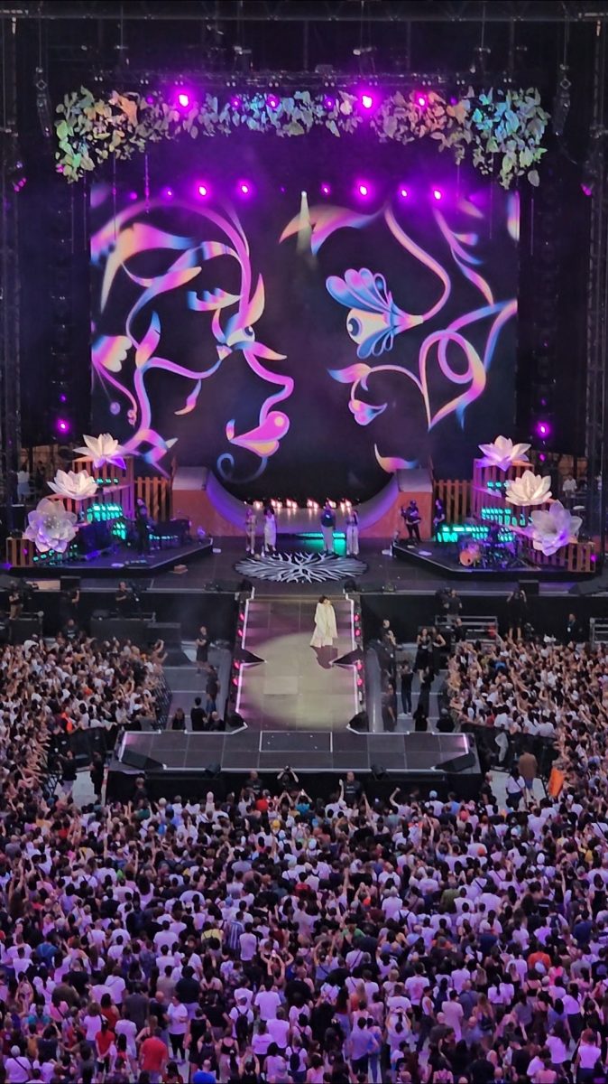 Dieci laser Atom da 42 watt dominano il palco, creando fasci luminosi che accompagnano i brani e arricchiscono gli effetti scenici, trasportando il pubblico in un’esperienza visiva onirica. E i visual dei brani combinano elementi naturali e mascherini video con fiori, alberi e piante, estendendo virtualmente la scenografia in uno spazio tridimensionale tra palco e schermi.