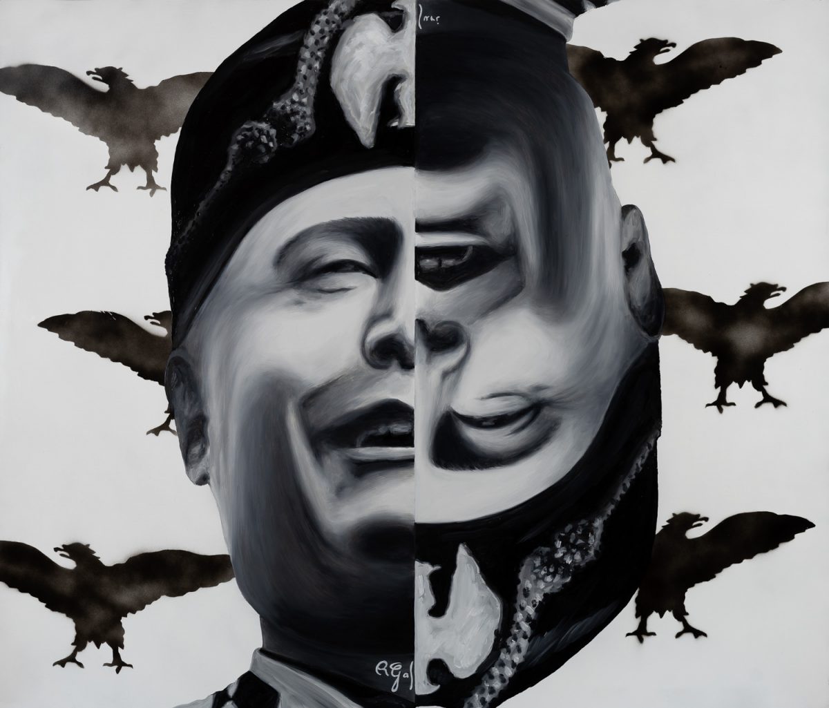 Il volto del Duce campeggia in una doppia effige nel luogo in cui il suo cadavere fu esposto. L’opera si intitola “Uccellacci & Uccellini”, in riferimento a Pasolini e alla sua opera cinematografica. “Questa raffigurazione è il tentativo di parlare di un mondo che forse non esiste più, e tutto ciò mi porta a chiedermi se è ancora valido il vecchio concetto di borghesia e proletariato. Esiste ancora questo scontro di classe che Pasolini narrava così poeticamente nel suo film? Una domanda non scontata con la quale vi lascerò riflettere ognuno autonomamente nella propria intimità
