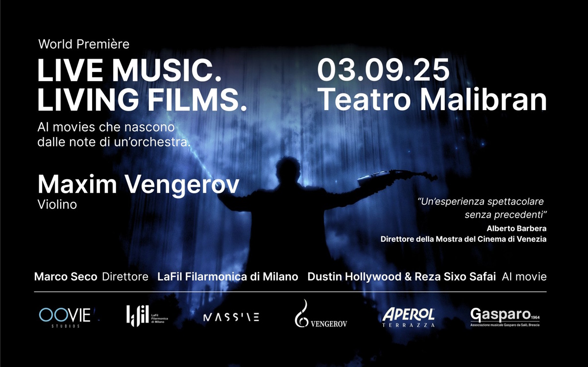Il 3 settembre 2025, lo storico Teatro Malibran di Venezia ospita la prima mondiale di Live Music. Living Films., progetto visionario di OOVIE Studios che fonde musica dal vivo, cinema e intelligenza artificiale. Presentato durante la 82ª Mostra Internazionale d’Arte Cinematografica di Venezia, l’evento vedrà il celebre violinista Maxim Vengerov e LaFil Filarmonica di Milano, diretta da Marco Seco*, dare vita a un’esperienza artistica senza precedenti.