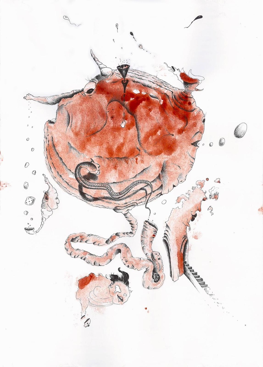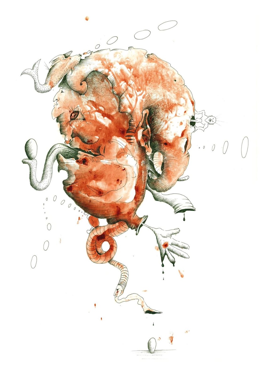 «Invece di scrivere qualcosa, mi è venuta subito la voglia di disegnare ciò che vedevo nella macchia con la penna china. – continua – Quando lo faccio mi sembra di entrare nei ricordi di quel bambino. La placenta mi affascina perché non ho ricordi di quando stavo in pancia, ma è lì che vivi le prime lotte e i primi amori con la mamma. Inizi a raschiare, ti fai le carezze: è un raggomitolarsi di emozioni che non ricordo». Eppure, qualcosa di quei mesi trascorsi in attesa resta.