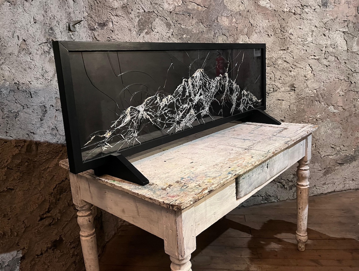 I due hanno lavorato insieme a Berna: «Disegnavo le prime linee e poi lui interveniva. – spiega – È stato un lavoro quasi in contemporanea. Alla fine aggiungo le lamine, ma è un processo che ha richiesto molto tempo». Esplorando la fucina, davanti a noi scorrono i rilievi del Monte Bianco, nuvole accennate, le forme della Val Camonica. La montagna è per Bill Claps primaria ispirazione, ma – più che i suoi profili – all’artista interessa cogliere il movimento della natura. Per farlo, usa una tecnica innovativa e complicatissima.