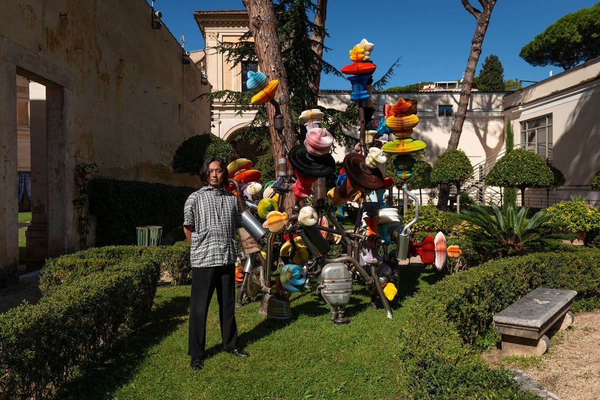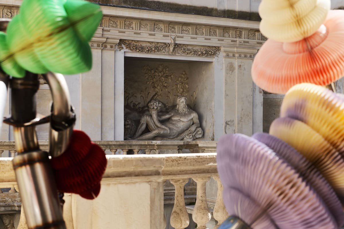 Dopo un attento intervento di restauro, il Ninfeo – riconosciuto come il primo teatro d’acque di Roma – accoglie oggi nove sculture biomorfiche di Miyazaki, realizzate con lamiere, parti di motori, carta impermeabile e feltro cucito. Materie povere e frammenti industriali che, come organismi rinati, dialogano con le decorazioni rinascimentali e con il mormorio delle fontane. È un ritorno simbolico alla vita, un invito a riconnettersi con la dimensione naturale e spirituale dell’acqua.