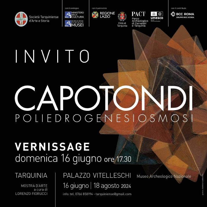È stata inaugurata il 16 giugno, al Museo Nazionale Archeologico di Tarquinia, la mostra dello scultore Claudio Capotondi dal titolo Poliedrogenesiosmosi. Il cortile e il loggiato del secondo piano di Palazzo Vitelleschi accolgono una significativa selezione di opere dell’artista, che saranno visibili al pubblico fino al 18 agosto. Dalle sculture in porfido alla serie di poliedri realizzati in PVC e ai disegni, che evidenziano la costante ricerca artistica dello scultore. La rassegna è promossa dalla Società Tarquiniense d’Arte e Storia che, per il secondo anno consecutivo, rispondendo a un avviso pubblico di manifestazione d’interesse pubblicato dal Parco archeologico di Cerveteri e Tarquinia, ha voluto proporre una serie di iniziative culturali di grande qualità.