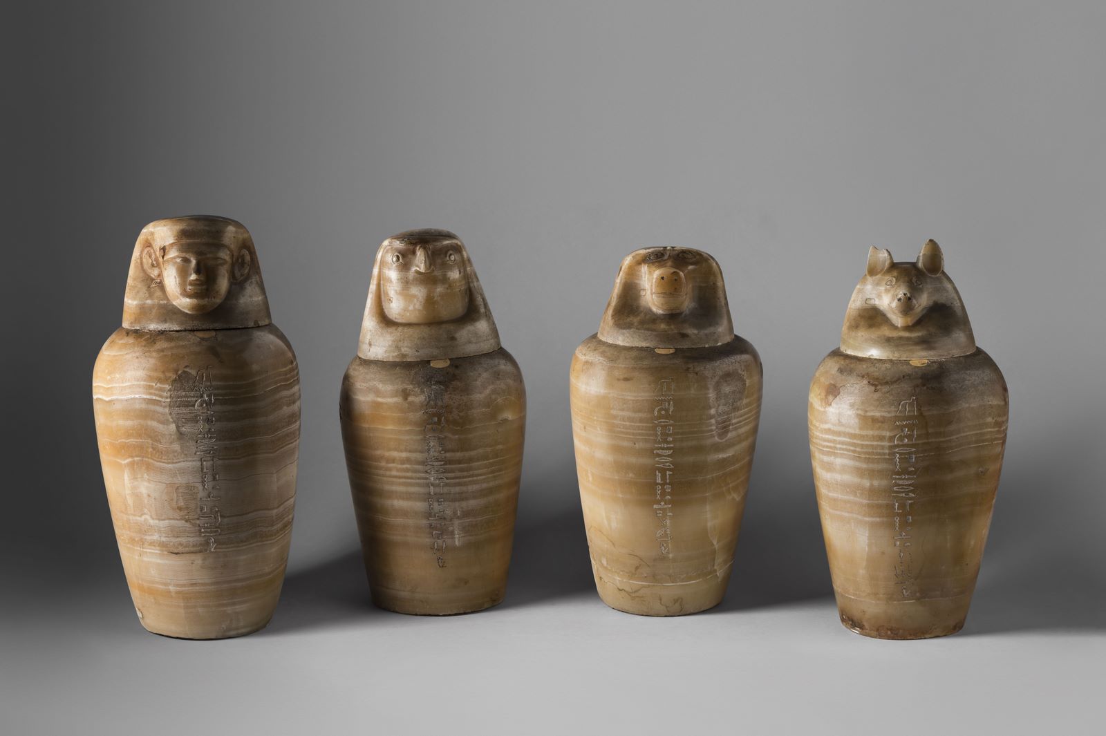 Immagine iconica scelta a rappresentare l’evento è una maschera funeraria di età romana (30 a.C. – 395 d.C.) proveniente da Assiut. Oltre a quest’opera, tra i reperti esposti, anche un modellino di imbarcazione dei corredi funerari del Primo Periodo Intermedio (2118 – 1980 a.C.). E il set completo di vasi canopi in alabastro di Ptahhotep, vissuto durante il Terzo Periodo Intermedio (1076 – 722 a.C.).