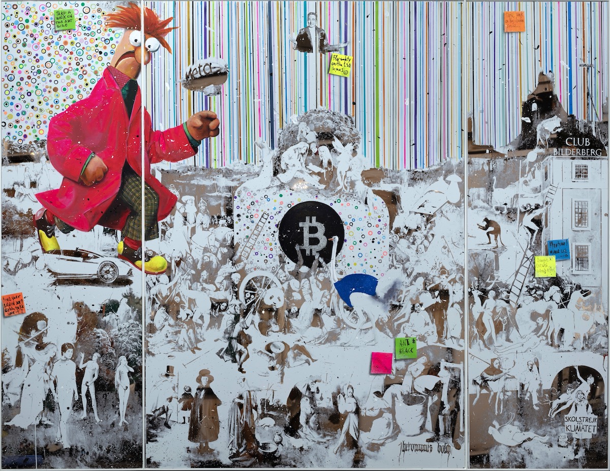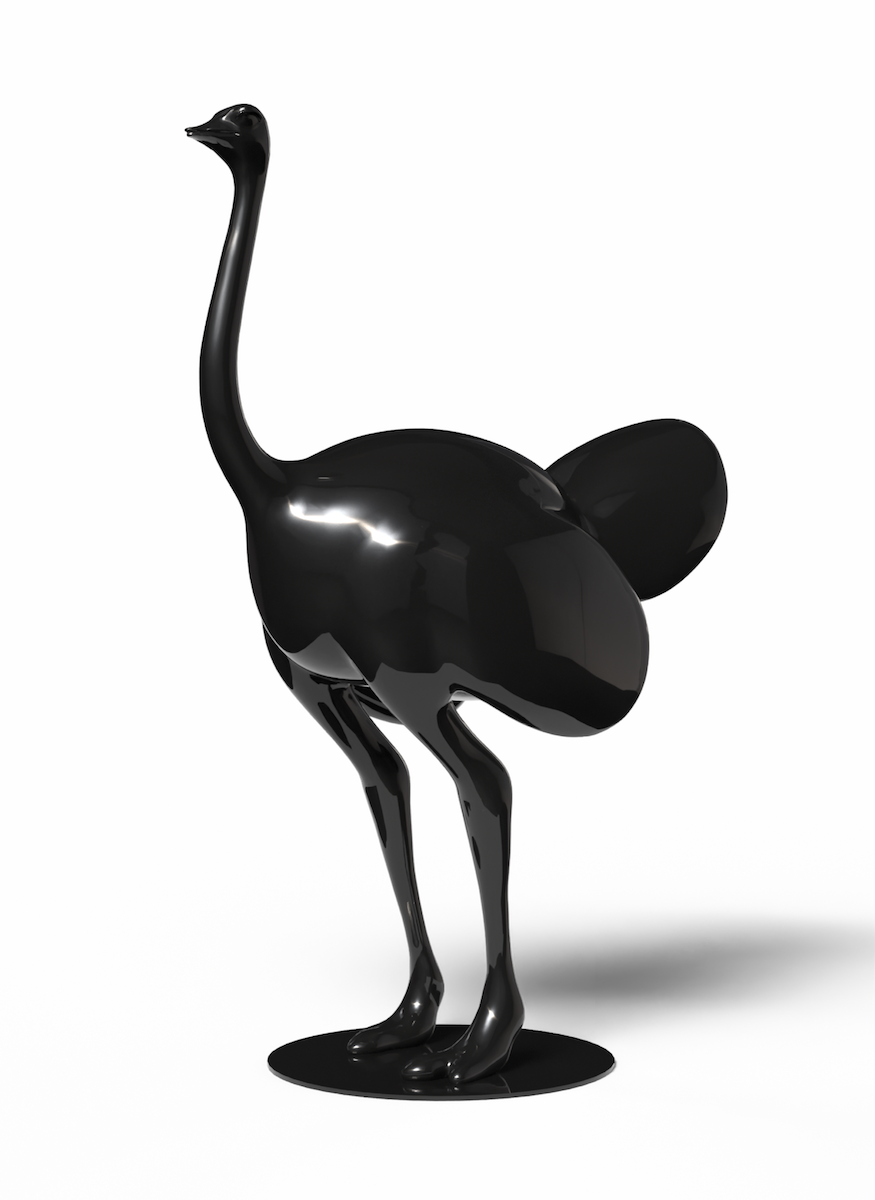 Le grandi sculture di struzzi neri – simboli di guardiani della soglia – si contrappongono agli struzzi confinati in voliere dorate, metafora dei sognatori intrappolati in una realtà scintillante ma limitante. Accanto agli struzzi scultorei, tele dai colori sgargianti raccontano icone e miti degli anni 80: un tuffo nel passato in cui riconoscersi guardando al contemporaneo e alle tensioni del presente.