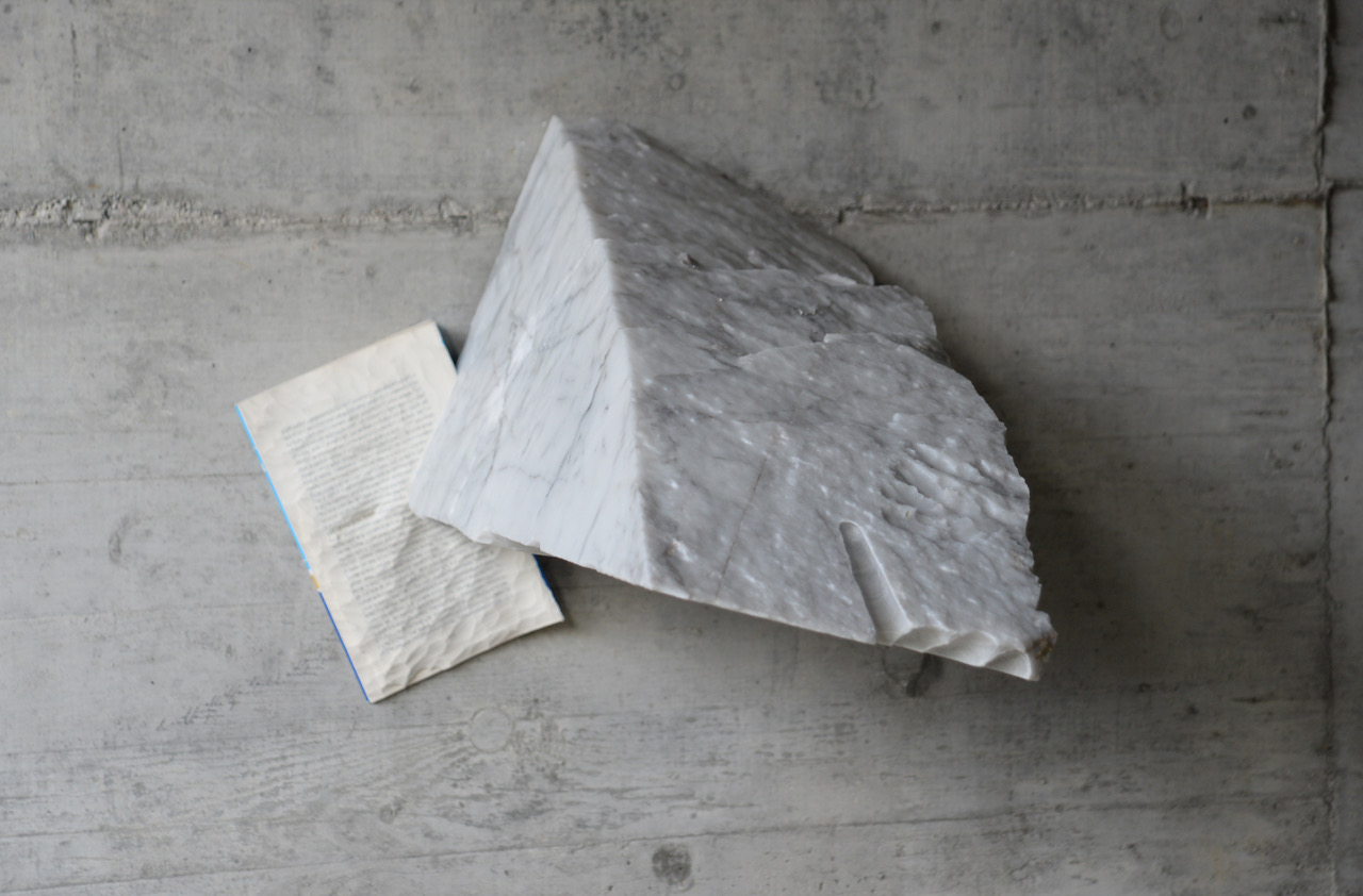 In questo processo, il libro si evolve in un assemblaggio vitale di materie. Così, l’artista lega il destino dei suoi libri a elementi naturali come la roccia, la pietra e il marmo, creando ibridi sorprendenti: libri che diventano rocce e rocce che assumono la forma di libri. Proprio questi ibridi trovano accoglienza negli spazi della galleria in modi diversi. Alcuni sono sospesi per ricostituire uno skyline, altri posizionati sul pavimento, altri ancora combinati con elementi architettonici come colonne di pietra.
