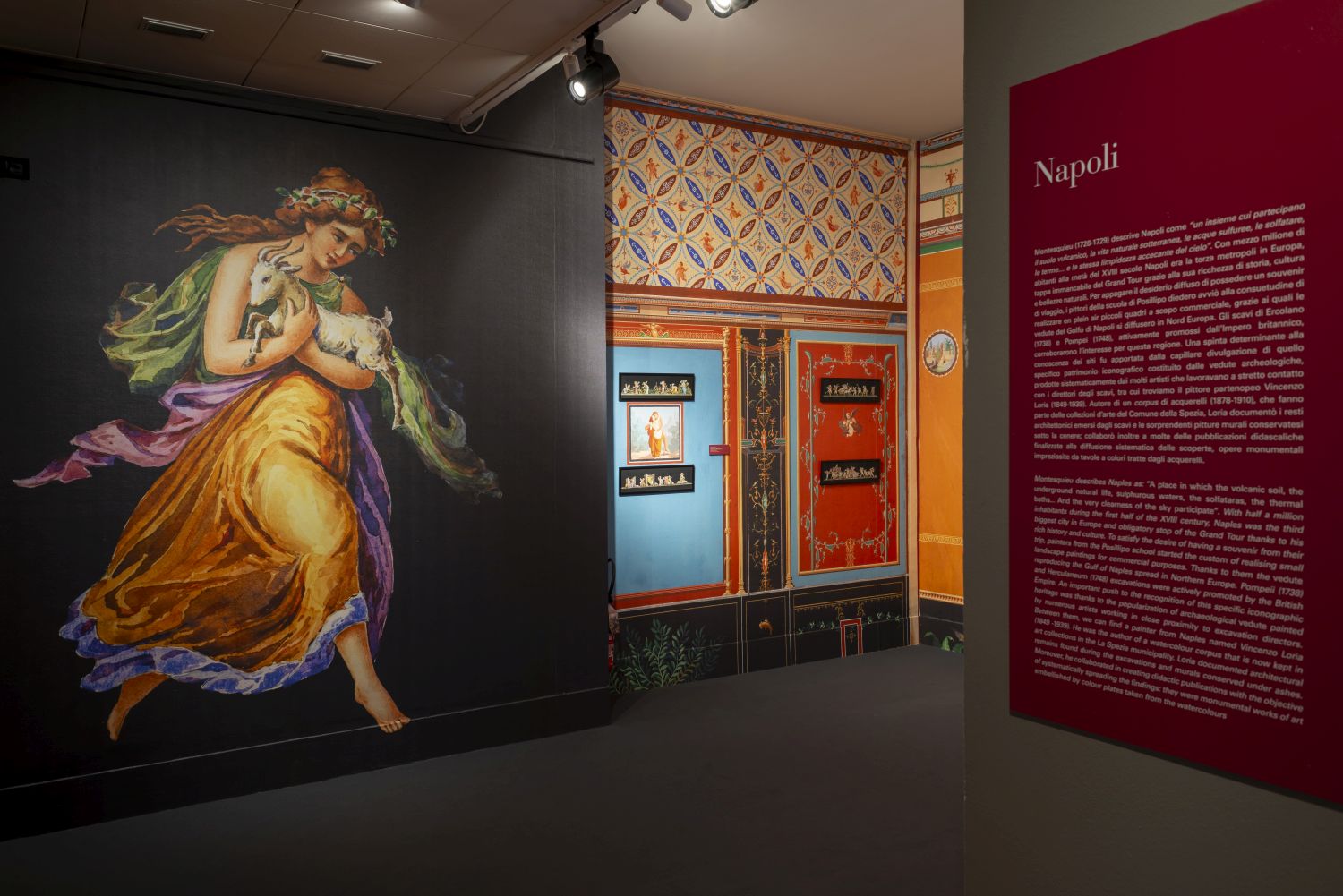 L’allestimento, unico e immersivo, arricchito da una selezione di dipinti, sculture e oggetti d’arte collegati alle collezioni del Museo Civico “Amedeo Lia”, fa rivivere l’esperienza originaria. Una sintesi tra la grazia della tradizione classica e la meraviglia dell’arte e della natura italiane. Affascinato da storia, cultura, arte e letteratura, il grand tourist esplorava anche siti iconici come Ercolano e Pompei. Quest’ultima, in particolare, fu meta di architetti, artisti e pittori tra cui Vincenzo Loria (1849-1939) che con i suoi acquerelli a tema pompeiano ha lasciato una preziosa testimonianza, oggi conservata proprio al Museo Civico di La Spezia.