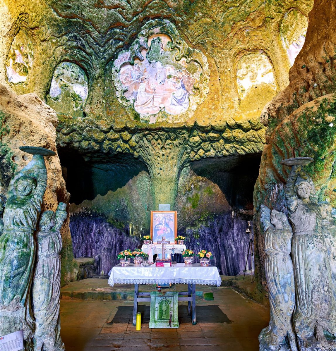 La Chiesa è composta da tre grotte, popolate da statue create dalla stessa roccia sedimentaria. Ai lati della porta d’ingresso 4 Angeli reggono le due acquasantiere la cui basi poggiano su dei leoni. Subito a sinistra è visibile la cappella della Madonna di Pompei, con angeli e fedeli inginocchiati.