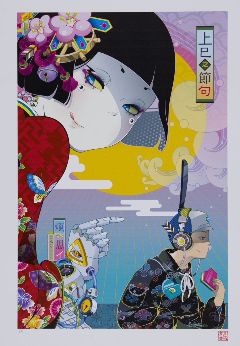 Accanto ai maestri, la mostra presenta artisti contemporanei che reinterpretano l’eredità di Kusama e Murakami. Tomoko Nagao (1976), esponente della MicroPop Art, mescola arte classica occidentale con elementi manga e icone pop, creando opere che vibrano di ironia e modernità. Hiroyuki Takahashi (1980) esplora il kawaii e le sottoculture giapponesi con illustrazioni digitali dai colori accesi, mentre Hitomi Maehashi (1985) dà vita a personaggi onirici ispirati all’animazione, in un trionfo di tonalità pastello. Non manca Bearbrick, l’art toy di Medicom Toy, che unisce arte, moda e design in un’icona globale.