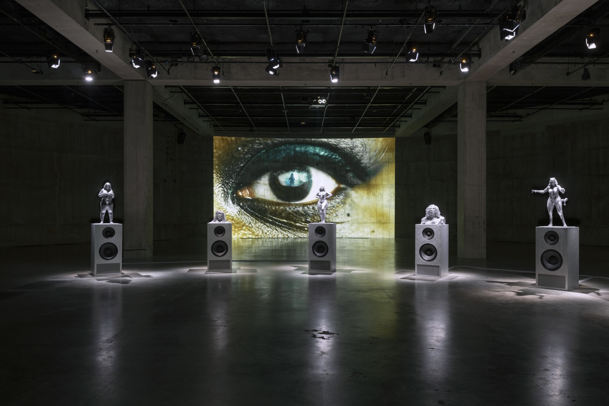 Attraverso tecniche di cut-up, frammentazione sonora e scrittura sperimentale – simili a quelle impiegate nel DJing e nella chirurgia estetica – l’artista crea connessioni tra la manipolazione dell’immagine digitale e il corpo umano. Al centro dell’installazione spiccano sculture in bronzo raffiguranti corpi femminili in diverse fasi di trasformazione, posizionate su casse acustiche che fungono da piedistallo. Mentre i riflettori si spostano da una figura all’altra, il paesaggio sonoro si trasforma, distorce e armonizza, creando un’identità sonora unica per ciascuna scultura.