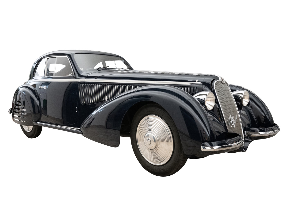 L’Alfa Romeo 8C 2900 B Berlinetta Touring (1938), creata per la Società Montecatini, incarna il gran turismo delle 8C 2900, nate nel 1935 per le competizioni e celebrate con la tripletta alla Mille Miglia 1936 dalla Scuderia Ferrari. Dotata di un motore da 2900 cc, il massimo per le 8C, monta un robusto telaio allungato per comfort, cambio posteriore e freni idraulici a tamburo. Ordinata dalla Società Montecatini, fu carrozzata da Touring con una raffinata livrea blu scuro e feritoie stilizzate.