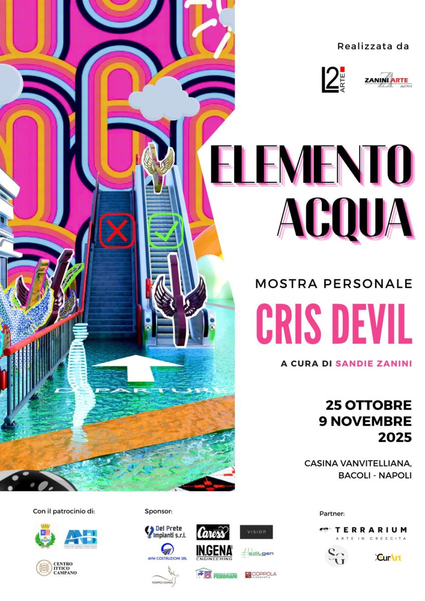 Elemento Acqua, questo è il titolo della nuova mostra personale di Cris Devil, in programma dal 25 ottobre al 9 novembre 2025 presso l’iconica Casina Vanvitelliana di Bacoli (Napoli). L’esposizione, curata da Sandie Zanini e realizzata da L2Arte e Zanini Arte, si propone come un potente invito alla riflessione sul valore dell’acqua, bene primario sempre più a rischio.