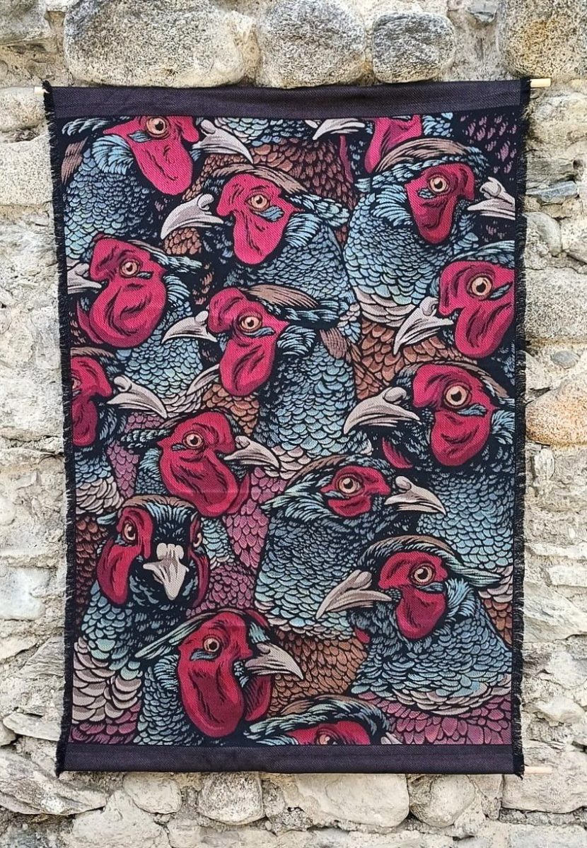 Negli arazzi il segno si traduce in trama, in racconto materico con figure animali, piante e simbologie naturali che si trasformano in narrazioni stratificate. Le opere su carta richiamano invece la poster art che ha reso Lucamaleonte un riferimento della scena street romana, con composizioni che conservano la stessa immediatezza visiva dei suoi interventi nei quartieri della città. Le linoleografie, infine, propongono una versione più intima e raccolta del suo iconico tratto, capace di rendere essenziale ogni dettaglio.