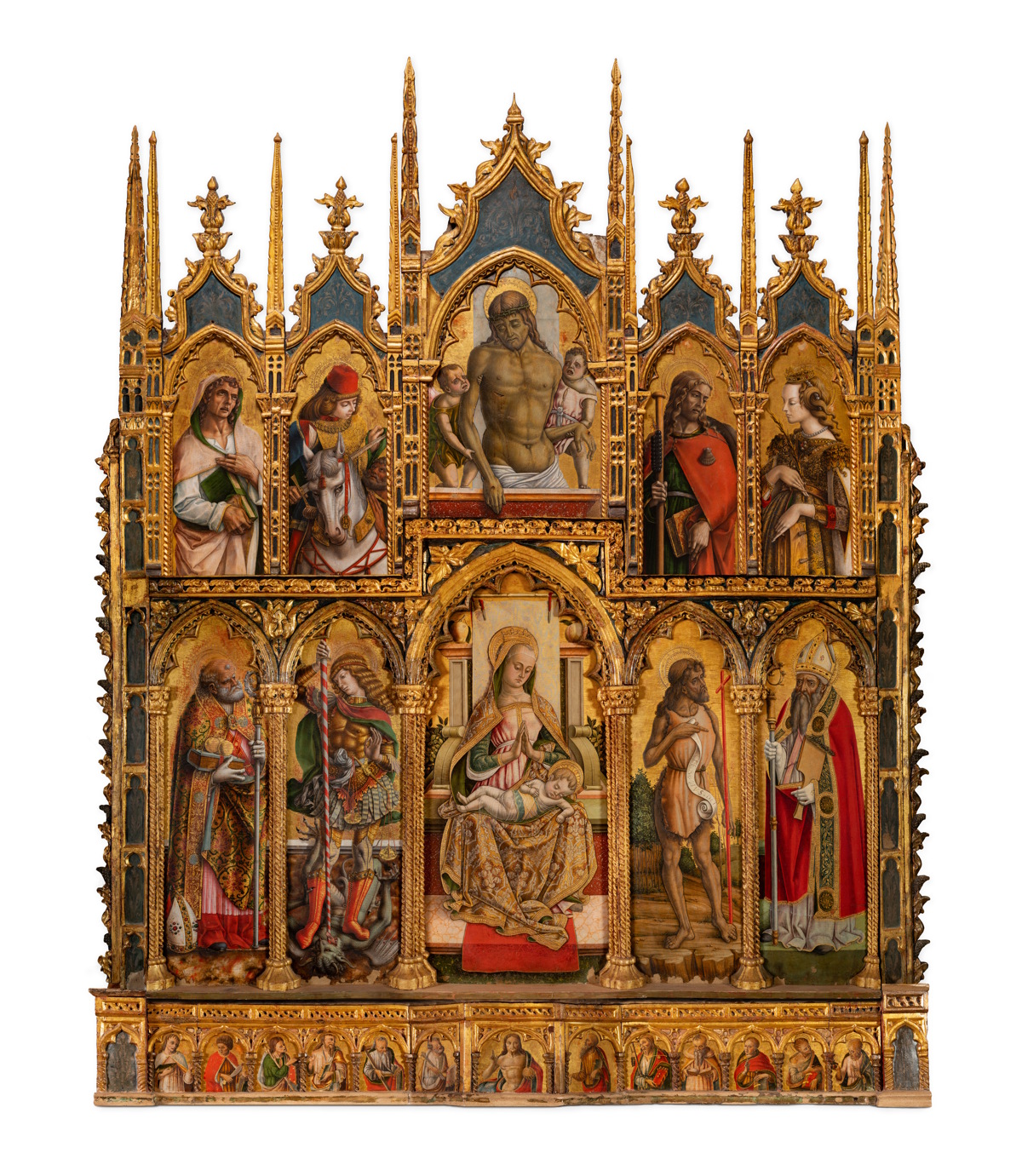 Composto da dieci tavole e da una predella con Cristo benedicente tra gli apostoli, il polittico (datato intorno al 1490) ha al centro la Vergine con il Bambino, immagine sacra che dialoga perfettamente con il tempo liturgico delle festività. La sua presenza a Milano è frutto di una complessa collaborazione tra istituzioni: Comune di Milano, Arcidiocesi di Fermo, Intesa Sanpaolo, Palazzo Reale, Gallerie d’Italia, la Parrocchia di Monte San Martino e Civita Mostre e Musei, con il sostegno di Rinascente.