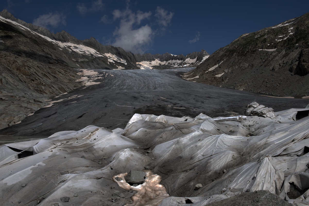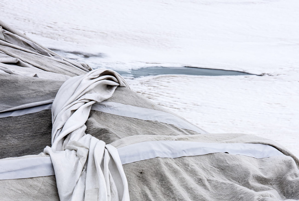 Realizzato in occasione dell’Anno Internazionale della Preservazione dei Ghiacciai, il percorso espositivo attraversa le Alpi dal Presena alla Marmolada, trasformando i segni dell’intervento umano – come i teli geotessili stesi per rallentare lo scioglimento del ghiaccio – in metafore visive della tensione tra cura e accanimento, difesa e illusione.