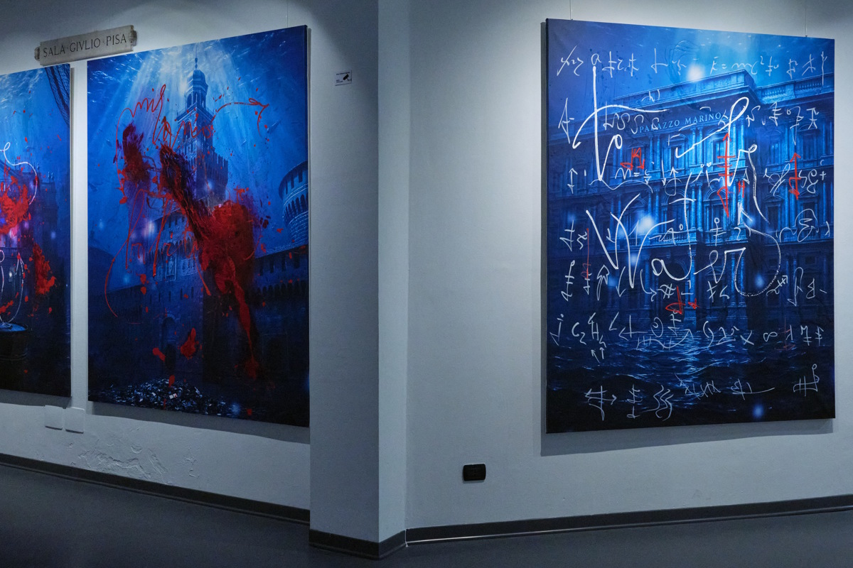 Cuore dell’esposizione sono otto grandi tele di Marco Nereo Rotelli, dedicate ad alcuni dei luoghi simbolo di Milano. Dalla Stazione Centrale al Duomo, dal Castello Sforzesco a CityLife, fino allo stesso Acquario Civico, rappresentati come se fossero completamente sommersi dall’acqua. Tra elementi naturali e detriti del consumo umano, come bottiglie, scarpe e barattoli, emergono versi poetici e scritture luminose, cifra stilistica dell’artista, che amplificano il senso di sospensione e urgenza.