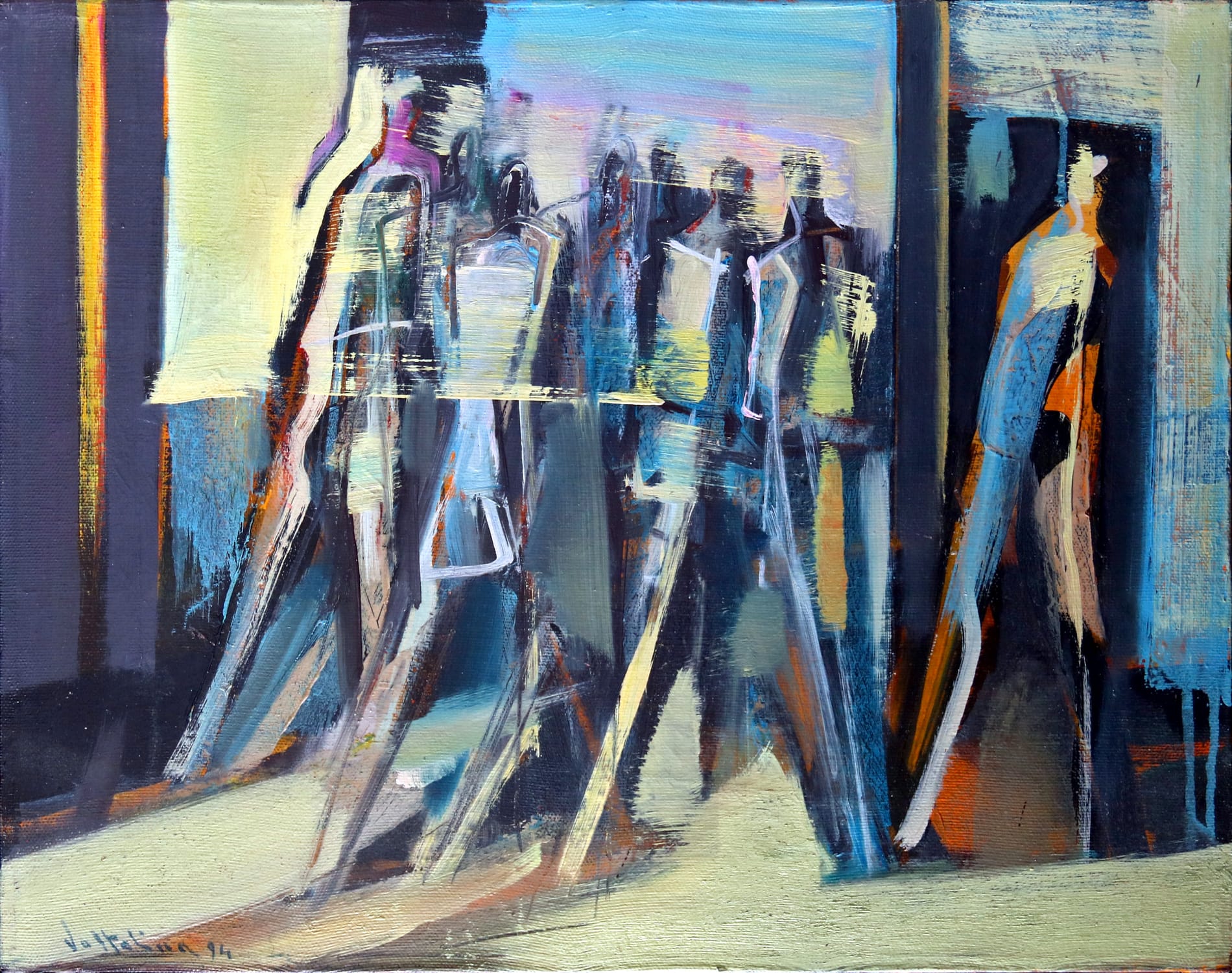 La pittura di Voltolina si fonda sulla rapidità del gesto e su una tensione costante verso l’essenziale. Le sue tele sono così attraversate da figure in movimento, incontri fugaci, passaggi urbani e frammenti di vita, che si fissano sulla superficie pittorica senza mai cercare la compiutezza formale. E ogni quadro diventa un luogo di attraversamento, un ponte tra visione e memoria, tra presenza e dissolvenza.
