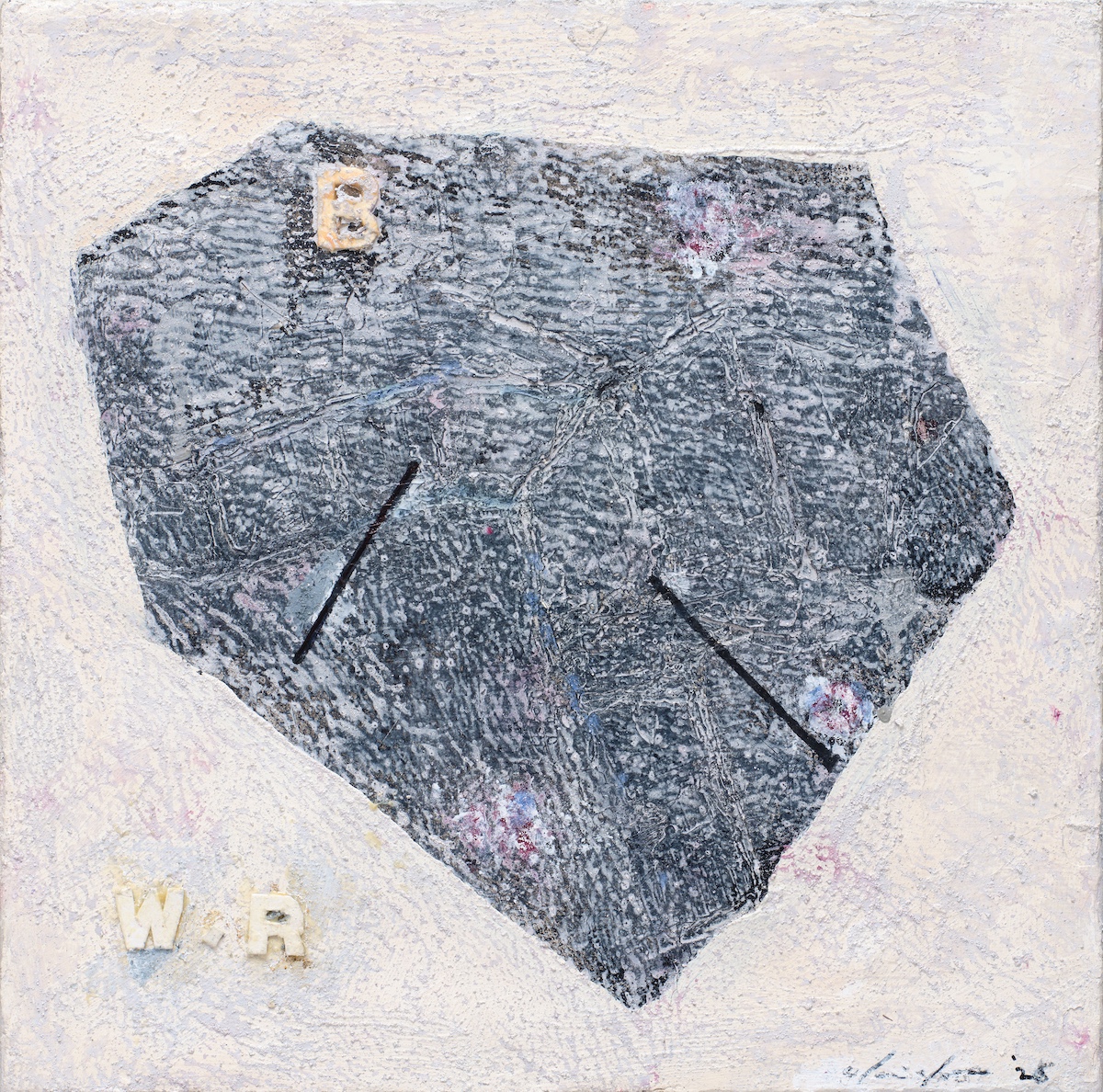 Nella serie Ship of Odyssey la tela diventa allo stesso tempo vela e mappa, uno spazio attraversato da simboli compressi, numeri e segni che evocano rotte e coordinate. Le superfici, dominate da bianco e nero, vengono costruite attraverso stratificazioni di materiali – sabbia, cemento e pigmenti – successivamente graffiati e incisi con coltelli e pennelli fino a far emergere forme come scale, ali o numeri.
