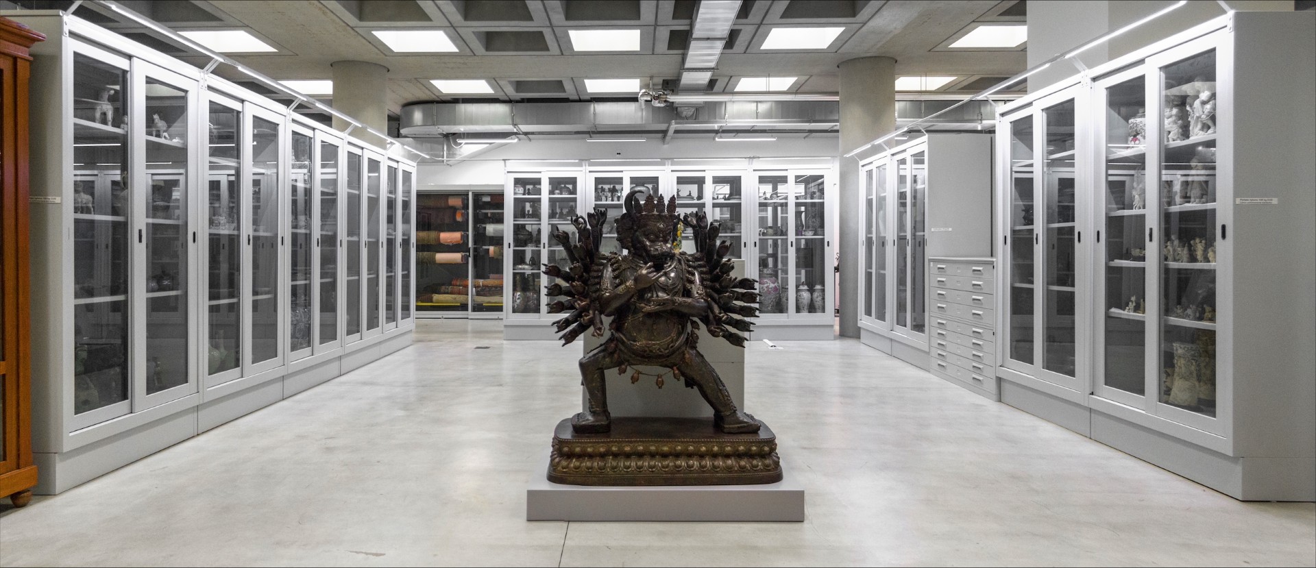 Negli spazi dedicati alla conservazione e allo studio, il patrimonio del museo è organizzato per aree geografiche: dall’Africa all’Asia, dalle Americhe all’Oceania. A queste sezioni si affiancano tre aree tematiche dedicate a strumenti musicali, cappelli e ventagli, testimonianze di tradizioni e culture lontane.