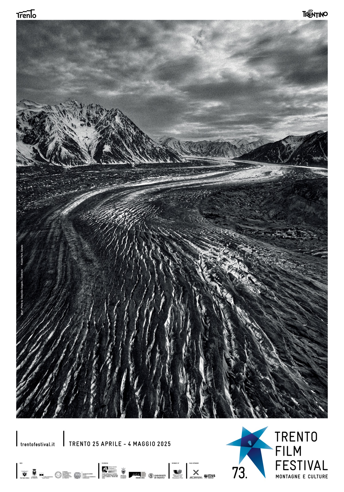 Il 73° Trento Film Festival sceglie la fotografia per il suo manifesto ufficiale, e lo fa con uno degli artisti più iconici del nostro tempo: Sebastião Salgado. A oltre vent’anni dall’ultima volta, il Festival torna, infatti, a puntare su un’immagine fotografica, scegliendo un potente scatto in bianco e nero che ritrae il ghiacciaio di Kluane Park, in Canada.