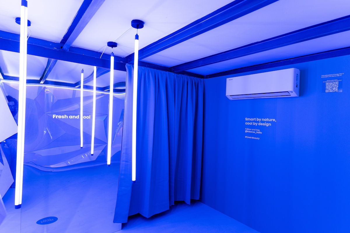 The Cool Zone crea un’atmosfera fresca e avvolgente, come quella del condizionatore Energy Pro X, amplificando la sensazione di leggerezza e benessere. Le pareti traslucide e le luci fredde evocano la purezza del ghiaccio e invitano a sprigionare la propria freschezza e frizzante personalità. The Hot Spot, è uno spazio vibrante e glamour. Le pareti diventano griglie e, insieme alle luci LED rosse, trasmetteranno tutto il calore dell’interno di un forno. Protagonisti saranno i forni pizza BI350XPZ e BI350BGPZ in un’ambientazione unica dove esprimere tutta la propria forza ed energia.