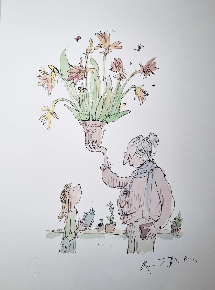 Poche firme evocano immediatamente un immaginario come quella di Sir Quentin Blake (1932), illustratore che ha accompagnato l’infanzia di milioni di lettori, collaborando con Roald Dahl, Michael Rosen e tanti altri autori. Insignito di onorificenze come il CBE e la nomina a Companion of Honour nel 2022, Blake partecipa all’asta con la stampa Flowering Plant.