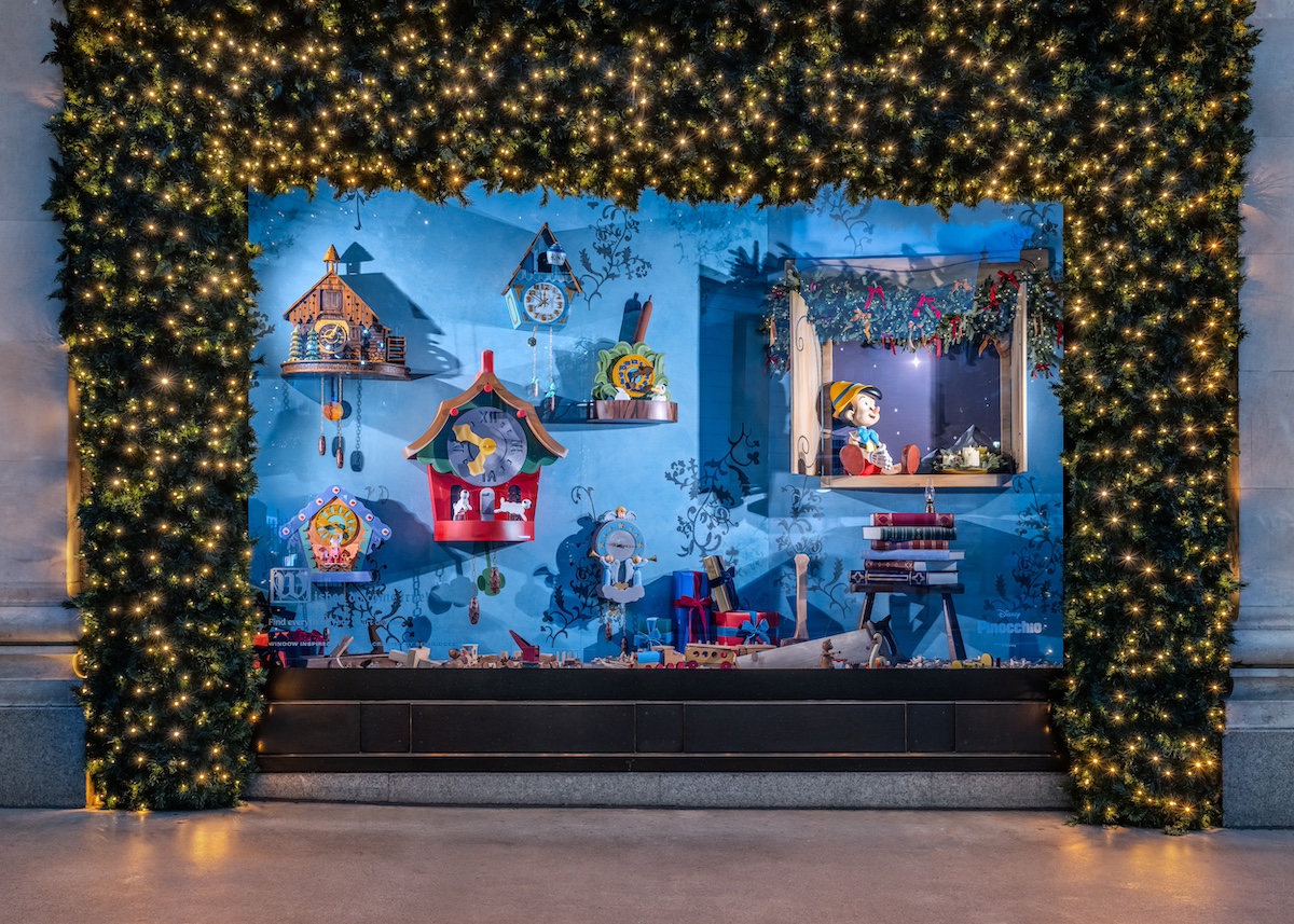 In una delle vetrine, ad esempio, i visitatori possono interagire con Trilli, che sparge polvere di fata nella stanza dei Darling in tempo reale. È un’estetica che unisce l’artigianato tradizionale del décor natalizio al linguaggio delle nuove tecnologie, portando nel retail la stessa intensità narrativa di un’installazione museale.