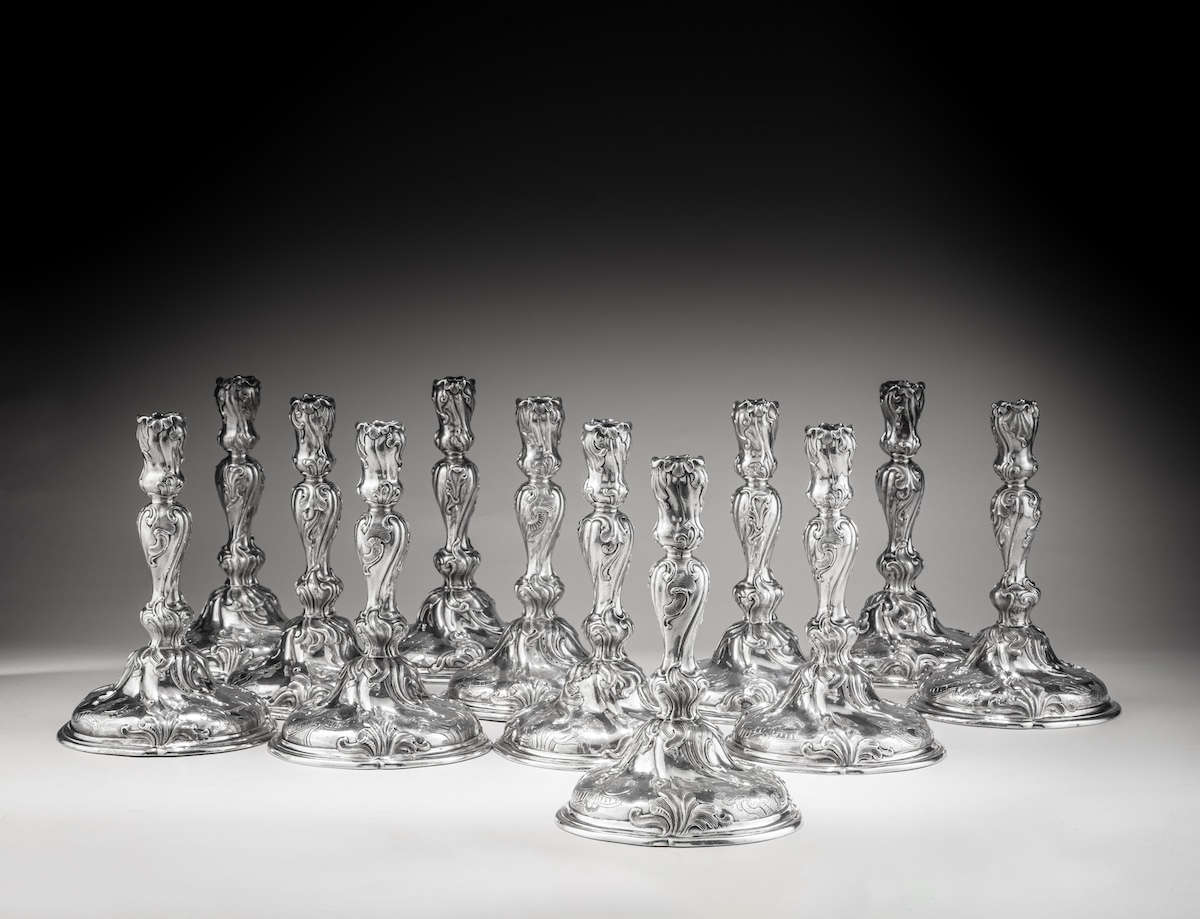 Foto Preview: Set di dodici candelabri reali tedeschi in argento, Christian Heinrich Ingermann, Dresda, 1745–46. © Florian Perlot Born & Art Digital Studio / © Sotheby’s.