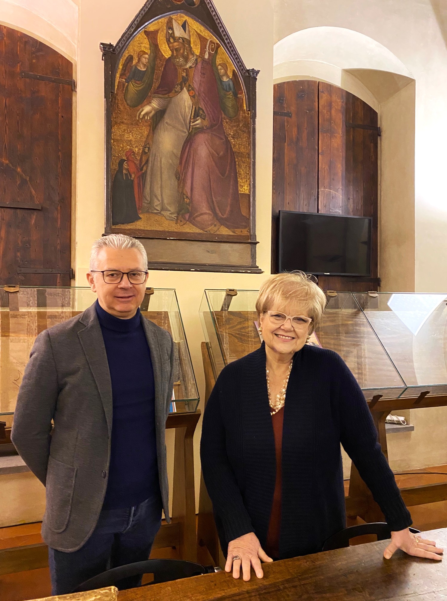 Il dipinto, attribuito a Lorenzo di Bicci e intitolato Santo Vescovo in trono con donatori, è conservato all’Archivio di Stato di Prato, luogo tutt’altro che casuale. L’edificio fu dimora della famiglia Datini e ne custodisce il celebre fondo documentario, una delle memorie più vive e preziose della città.
