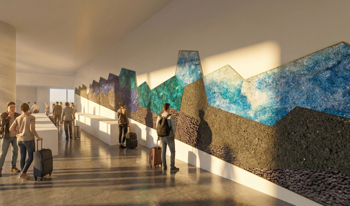 Secondo Alfonso Femia, l’opera di CaCO3 è risultata la più capace di interpretare non solo il briefing, ma anche la visione complessiva del progetto. A convincere è stato, afferma l’architetto, la «texture molto raffinata ed esito di uno studio approfondito su materiali e tecnica compositiva. E su un’interessante esplorazione materica, sia nella sua astrazione, tramite la composizione evocativa di un paesaggio inatteso e frastagliato della costa mediterranea. È stato anche apprezzato il portato innovativo e la capacità di volgere lo sguardo verso il futuro. L’opera si pone sul crinale tra ricerca artistica e design ed è adatta ad essere apprezzata dal pubblico eterogeneo che transiterà nella hall del terminal».
