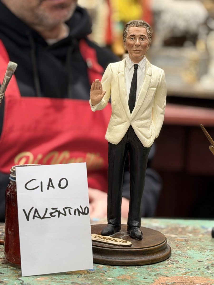 A sancire l’affetto del popolo per Valentino ci ha pensato anche Gennaro Di Virgilio, storico artigiano del presepe di San Gregorio Armeno: in poche ore ha preparato la statuina del presepe dedicata all’iconico stilista, nella sua giacca bianca, e l’ha presentata al suo vasto seguito social accompagnata dal biglietto ciao Valentino.